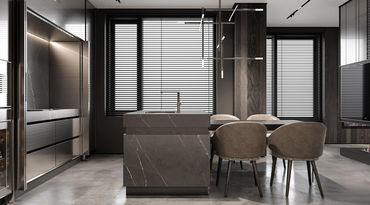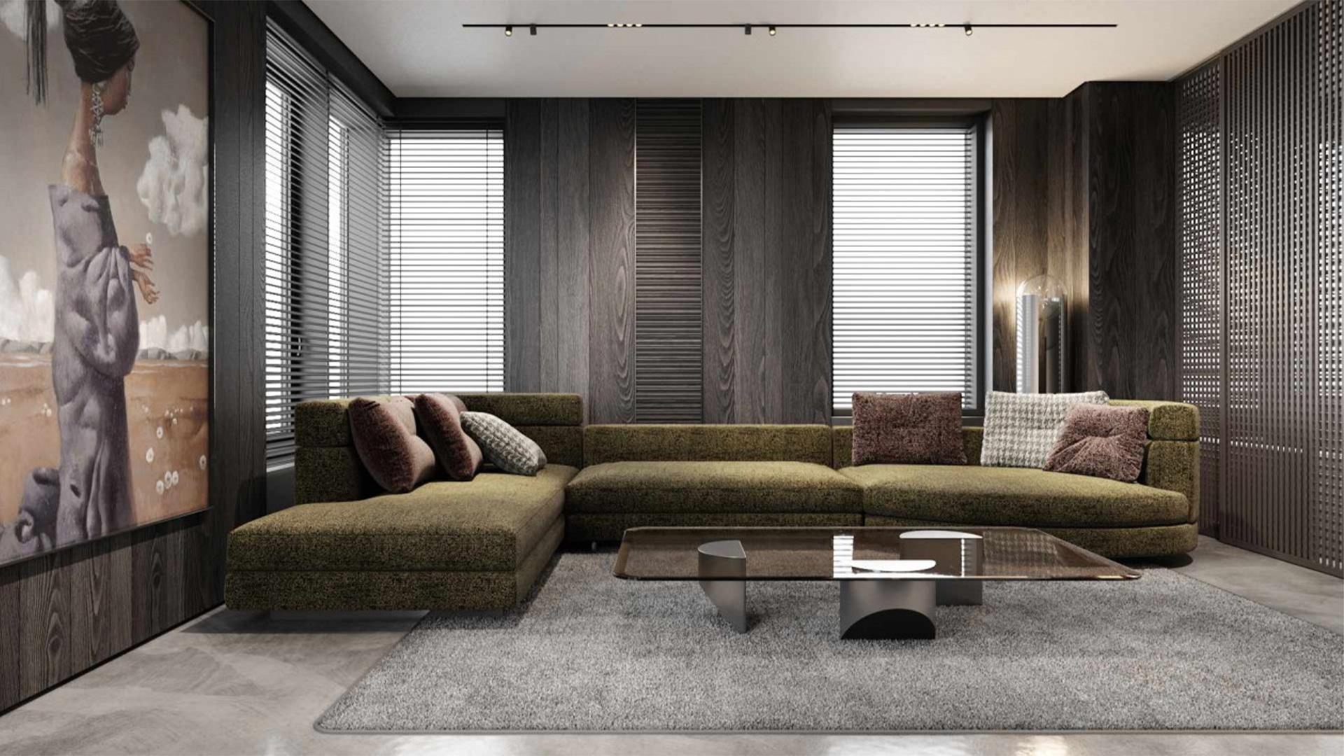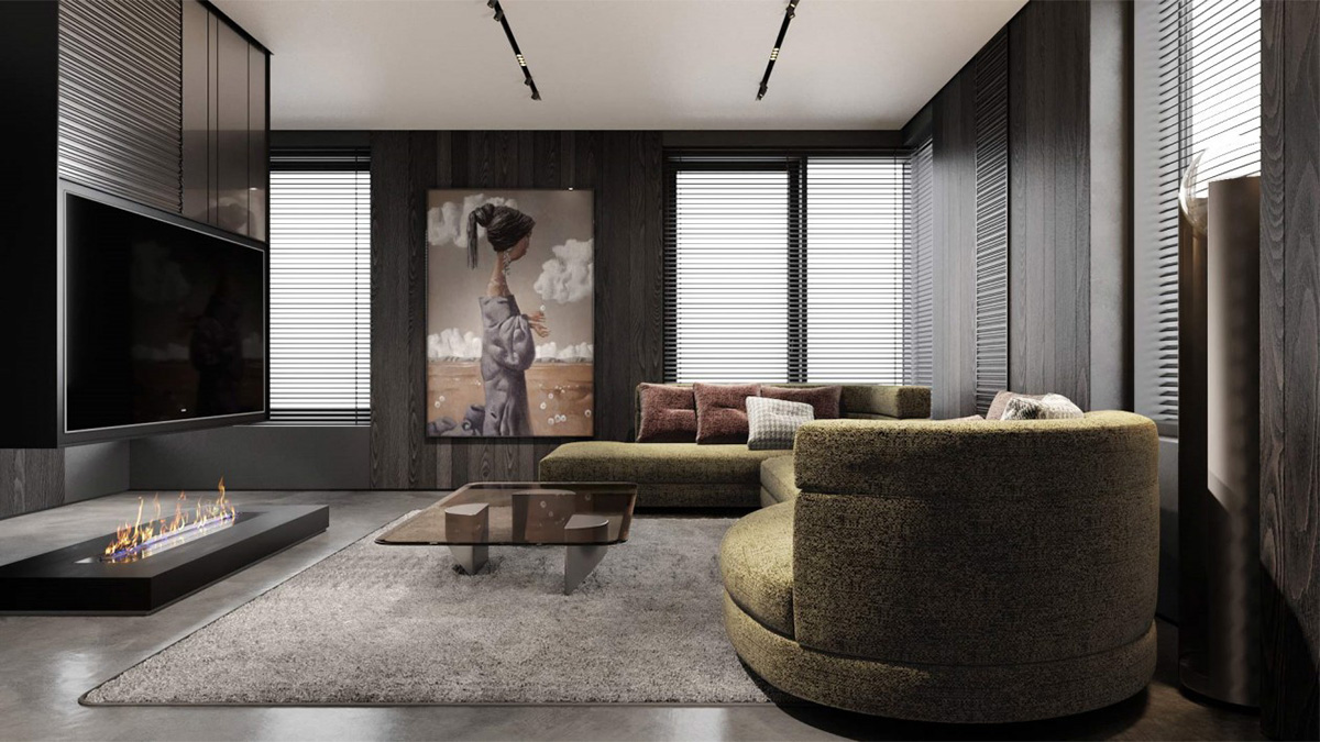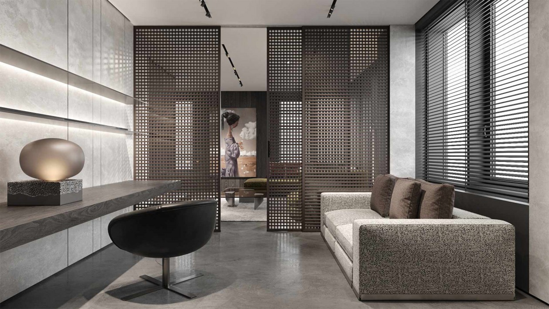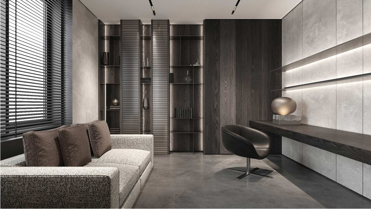 在这个项目中,设计师又大量运用深色木纹,高级绒布和深灰色大理石,创造出另一种低调又奢华的空间氛围。